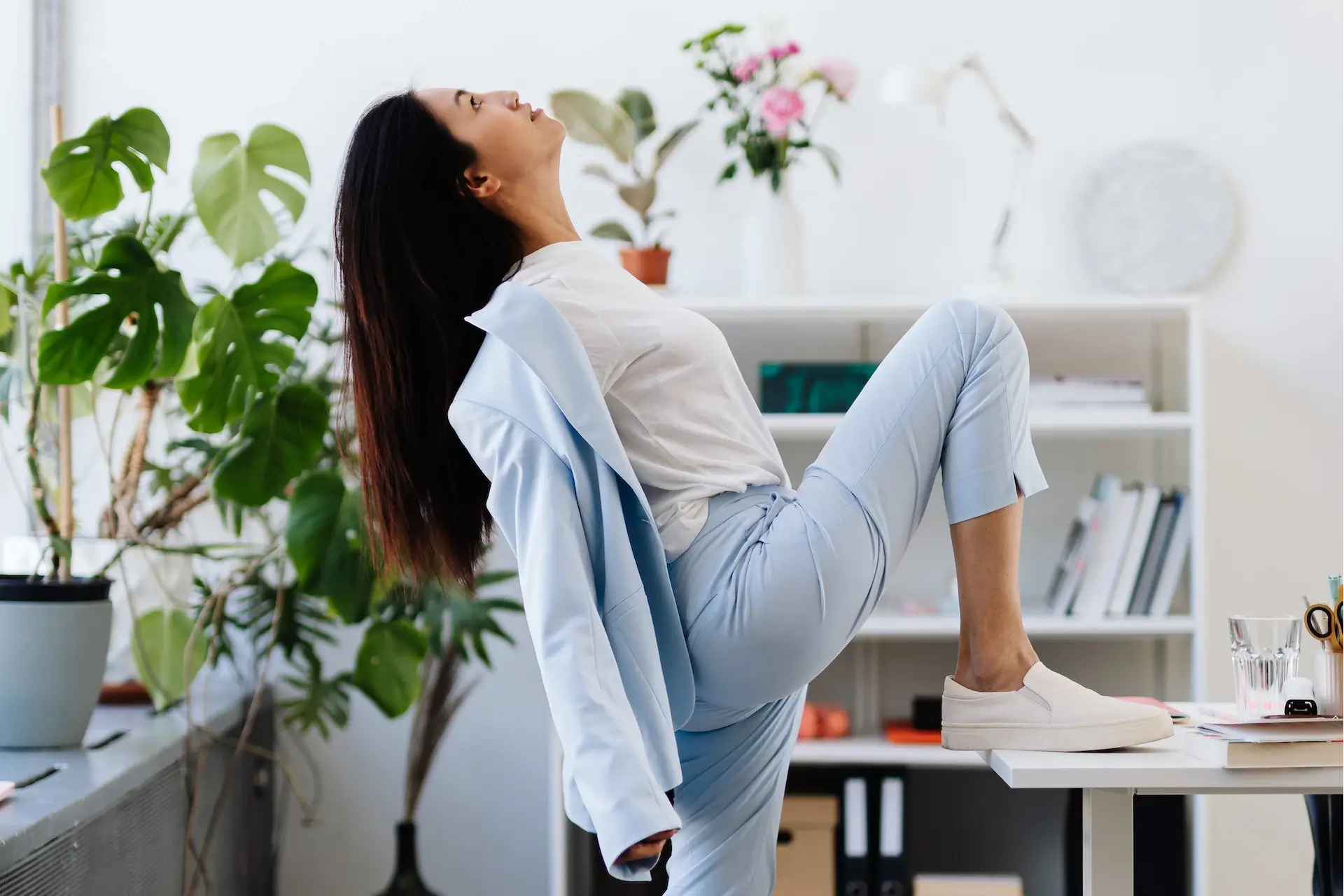 - Bureaustoelsquats: Sta op van je bureaustoel, houd je rug recht en buig je knieën alsof je weer gaat zitten maar raak de stoel net niet aan. Sta vervolgens weer op. Herhaal dit 10 tot 15 keer.