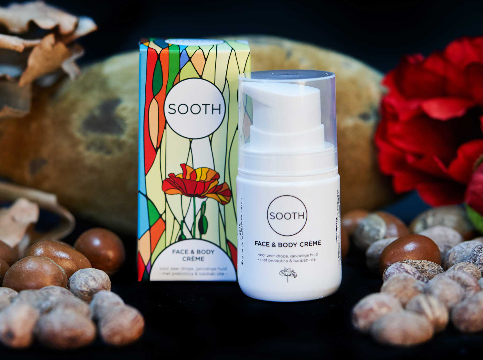 Sooth bevat alleen natuurlijke ingrediënten, zoals Baobab olie en Prebiotica. Deze ingrediënten voeden, beschermen en versnellen het herstel van de huid. Dankzij de natuurlijke ingrediënten, is de crème zo zacht dat het gebruikt kan worden door mensen waarvan de huid extra gevoelig of droog is. Bijvoorbeeld als een bijwerking van chemo of medicijngebruik. Sooth is dermatologisch getest en geschikt voor de gevoelige huid. Daarnaast plakt de crème plakt niet en is deze ook niet vettig.